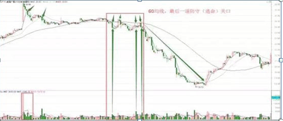 2、15分钟K线图,股价下穿15分钟MA均线当中的60日生命线,并伴随明显持续的放量时,是最后的高抛良机(关键词:下穿、明显放量、持续放量)。